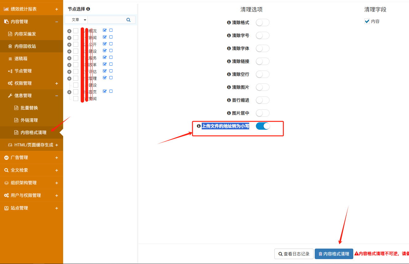 使用内容格式清理功能,左侧栏目不勾选代表全部栏目,右侧只勾选“上传文件的地址转为小写”,点击开始转换,注意提前备份数据库;待清理完成后查看原大写路径是否变为小写。