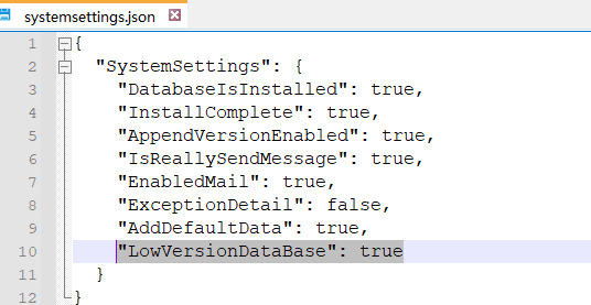 \Configuration\systemsettings.json下添加"LowVersionDataBase": true