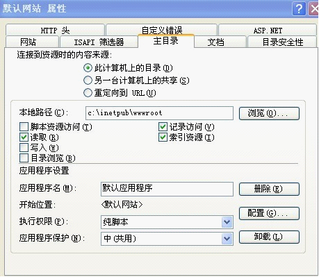 总结:也就是说一般不要打开IIS控制面板下主目录的(写入),(脚本资源访问) 这两项,以及不要选上(纯脚本和可执行程序),选(纯脚本)就可以了。需要asp.net的应用程序的如果应用程序目录不止应用程序一个程序的可以在应用程序文件夹上(属性)-目录-点创建就可以了。不要在文件夹上选web共享。