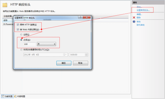 IIS7的管理器里有个HTTP响应标头的功能,一般网站的脚本、样式和图片分别放在scripts,styles,images目录下,我们直接为这几个目录下的文件设置过期时间为100天就可以了,