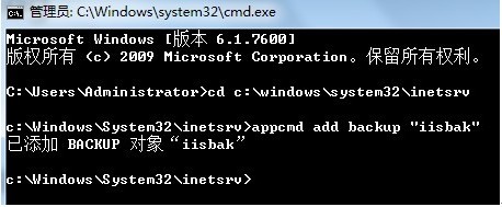先输入:cd c:windowssystem32inetsrv 回车(意思为进入到c盘的iis备份目录),再输入appcmd add backup "iisbak"(意思为增加一个备份,备份的名称为iisbak),