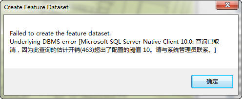 问题提示:ArcSDE for SQL Server 数据库,利用ArcGIS桌面创建数据集时,提示如下错误: