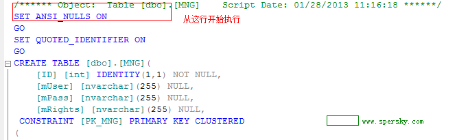 第四步:在要导入的数据库中新建查询:从SET ANSI_NULLS ON 处开始执行(可以删除这句前面所有语句)