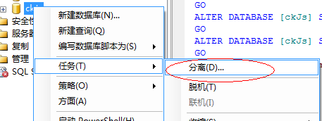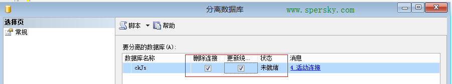 第一步:右键数据库,任务--分离--删除连接,更新... 打勾,确定