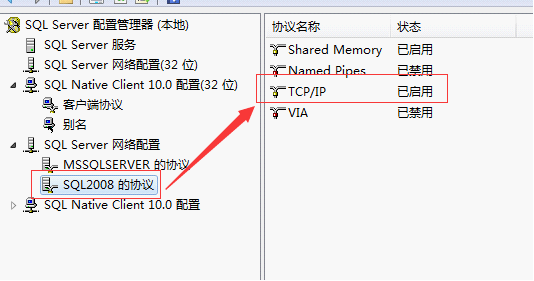 解决二:开始菜单SQL2008—配置工具—SQL SERVER管理器—SQL SERVER网络配置