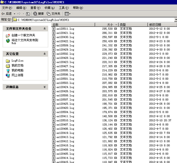 IIS存放日志文件的默认存储路径是c:windowssystem32logfiles 我们依次打开“我的电脑”,C盘,Windows文件夹,system32文件夹,logfiles文件夹,发现里面还有多个子文件夹,每个文件夹都对应一个IIS站点。我们逐个打开这些文件夹查看,发现里面有大量以.log后缀结尾的文件,这就是IIS日志文件。它们不仅数量多,而且每个文件占用字节数也大,如下图: