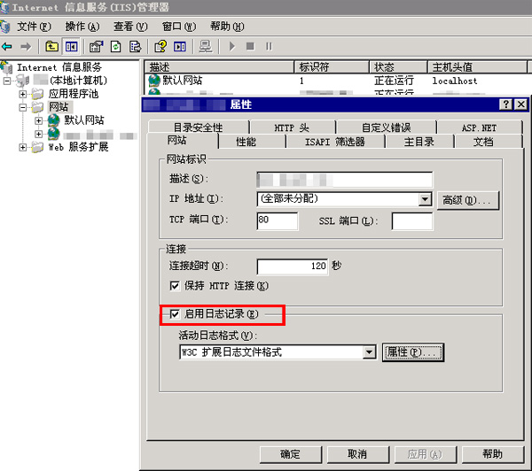 打开“Internet 信息服务(IIS)管理器”,选择到不需要记录IIS日志的站点,按下鼠标右键,选择“属性”,在默认的“网站”选项卡中将“启用记录的复选勾”去掉,点“确定”。如下图: