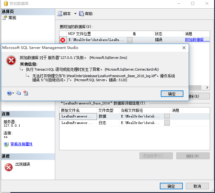 附加数据时,提示无法打开物理文件,操作系统错误5。如下图: