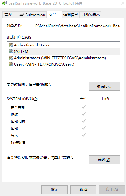 解决方案:找到数据库的mdf和ldf文件,赋予权限即可。如下图: