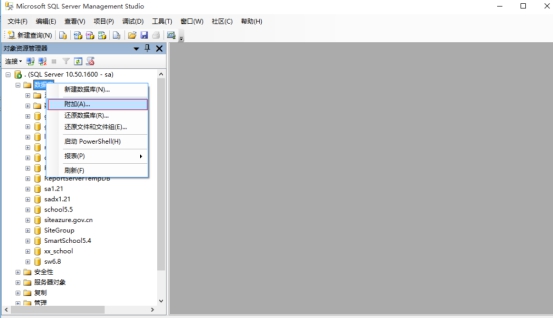 第三步:企业管理器》选择“数据库”》右键》所有任务》附加数据库》找到你的库文件》注意下边日志文件的位置》确定