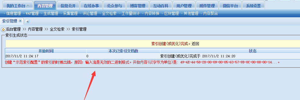 <p style="font-size: 12px; text-indent: 2em;"> <span style="font-size: 16px;"> <span style="color: rgb(255, 0, 0);">问题描述:</span> </span>生成全文检索索引时,出现下面报错:</p> <p align="center" style="font-size: 12px;"><img alt="" src="$/History/tech/uploadfiles/help/2017/11/201711201651530290.png" style="width: 984px; height: 330px;" /></p> <p style="font-size: 12px; text-indent: 2em;"><span style="color: rgb(255, 0, 0);"><span style="font-size: 16px;">解决方案:</span></span>备份好App_DataKTDictData文件,然后全部覆盖。</p>