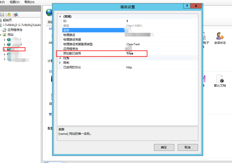 开启对应网站预加载,操作路径:网站 -> 对应网站 -> 右键,高级设置 ->选择,预加载已启用 True,如下图所示: