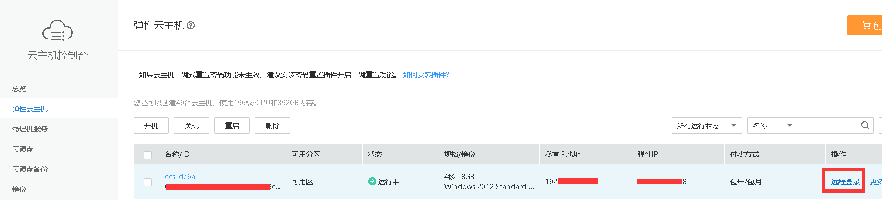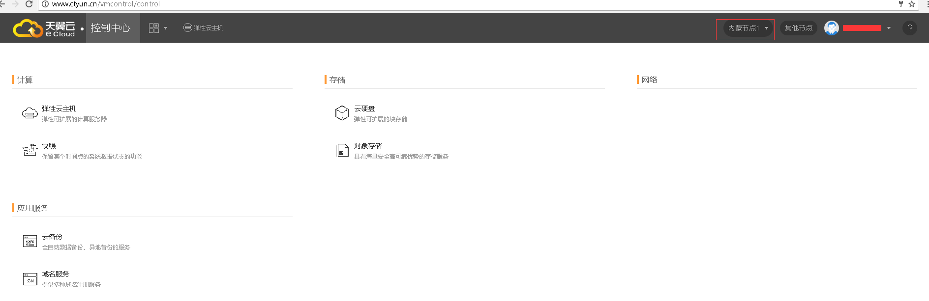 登陆后需要选择右上角的对应节点后,下方才能正确显示已经拥有的云主机信息;如果节点选择里面没有,直接点击“其他节点”会自动跳转到改账号下所拥有的云主机信息: