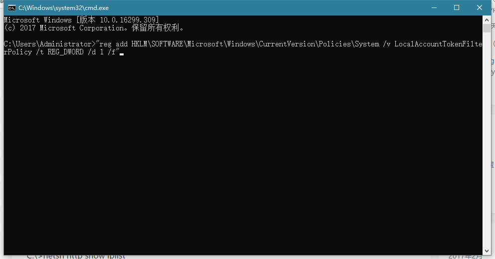 "reg add HKLMSOFTWAREMicrosoftWindowsCurrentVersionPoliciesSystem /v LocalAccountTokenFilterPolicy /t REG_DWORD /d 1 /f"