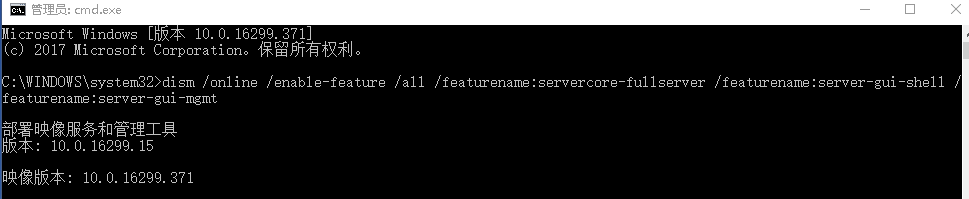 一般的办法就是重装操作系统,但其实有个简单的办法,已经在cmd窗口了,只需要执行dism /online /enable-feature /all /featurename:servercore-fullserver /featurename:server-gui-shell /featurename:server-gui-mgmt ,接下来就会自动部署映像服务;当提示是否重启电脑(Y/N)时只需重启就ok(若没有提示则会完成后自动重启)