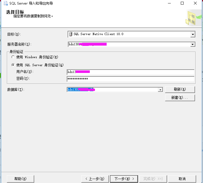数据源就选择默认的,windows登陆方式,然后下一步选择目标;填写正确的sql链接地址,用户名账号信息,选择导入到哪个数据库即可下一步;选择所有的表和视图,下一步,直到完成。