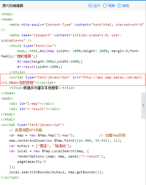 里面有很多样式的地图和调用的代码,这里我使用的是 检索示例,多个关键字检索的这个地图。把对应的div和js拷贝到我们的网页所需要的位置,把刚申请的密钥放在您的密钥的位置。