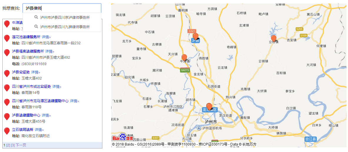 在网站的联系我们中经常使用到百度地图,今天就来简单讲讲百度地图是如何调用到我们的网站中的。客户给的参考网站中,实现的效果是左侧要有当地相关机构列表(律师事务所,公证处等)、还有搜索功能,右侧是百度地图。根据左侧的点击的结果,在地图上显示。查找百度地图示例效果没有一样的,只能参考做一个相似的,下面说一下具体流程。