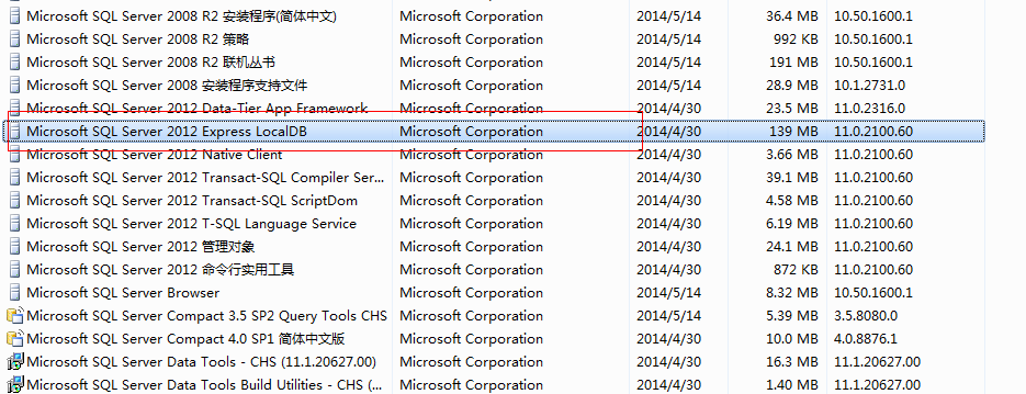 有软件管理器的打开软件管理器,没有的进入控制面板的程序卸载,将“Microsoft SQL Server 2012 Express LocalDB”卸载,可能VS2012版本不同,命名不同,请注意识别。