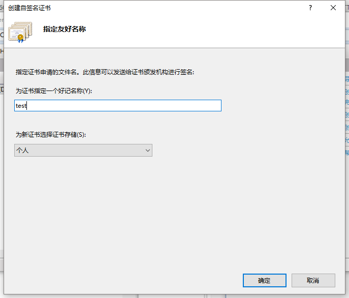 4、给自己创建的证书起名然后确定。