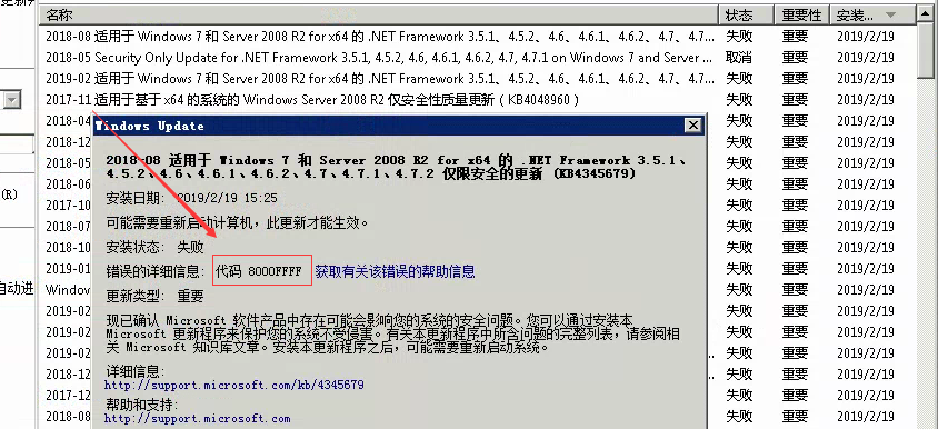 Windows2008 R2 更新补丁报“代码 8000FFFF windows update 遇到未知错误”,错误如下图:
