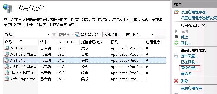 1、选择应用程序池操作面板上的“高级设置”。