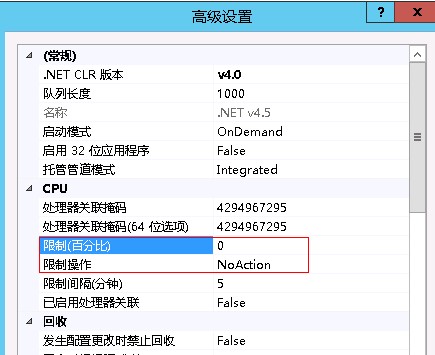 关于“限制(百分比)”这项,微软的官方解释是:限制(百分比)设置了应用程序池中的工作进程(即w3wp.exe)在“限制间隔“(默认5分钟)的时间段内使用CPU时间的最大百分比。如果超出这个限制,系统将记录到事件日志中,并且触发限制操作中的某个可选事件。
