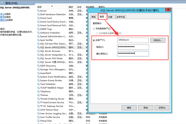 (1)在数据库服务器和备份服务器分别创建一个共享的账户,账号和密码设置相同,作为访问凭证。设置数据库服务器的SQL Server(MSSQLSERVER)服务的设置登录用户为共享用户。