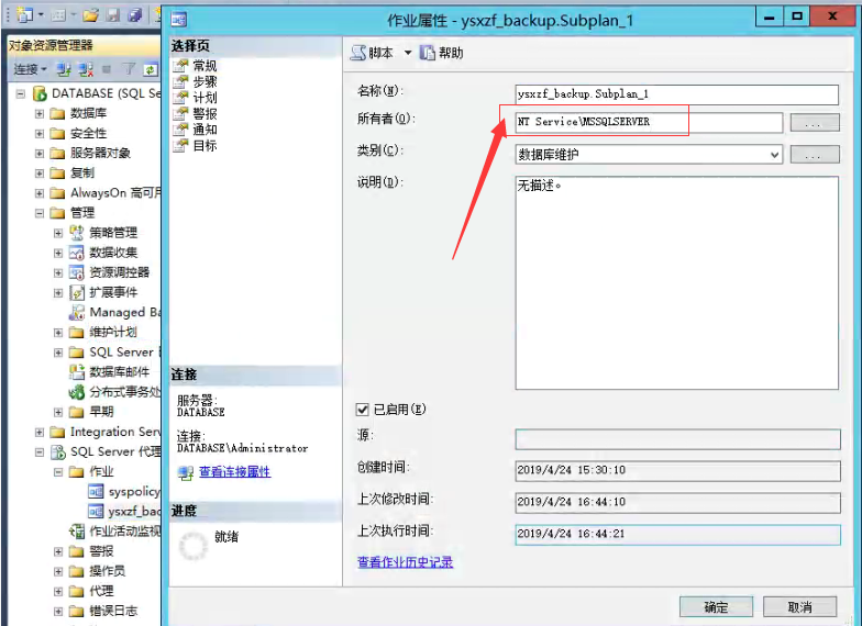 (2)将作业的拥有者改为“NT ServiceMSSQLSERVER”。