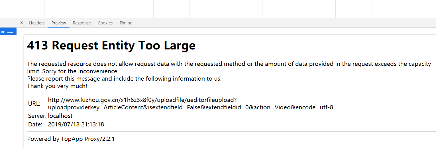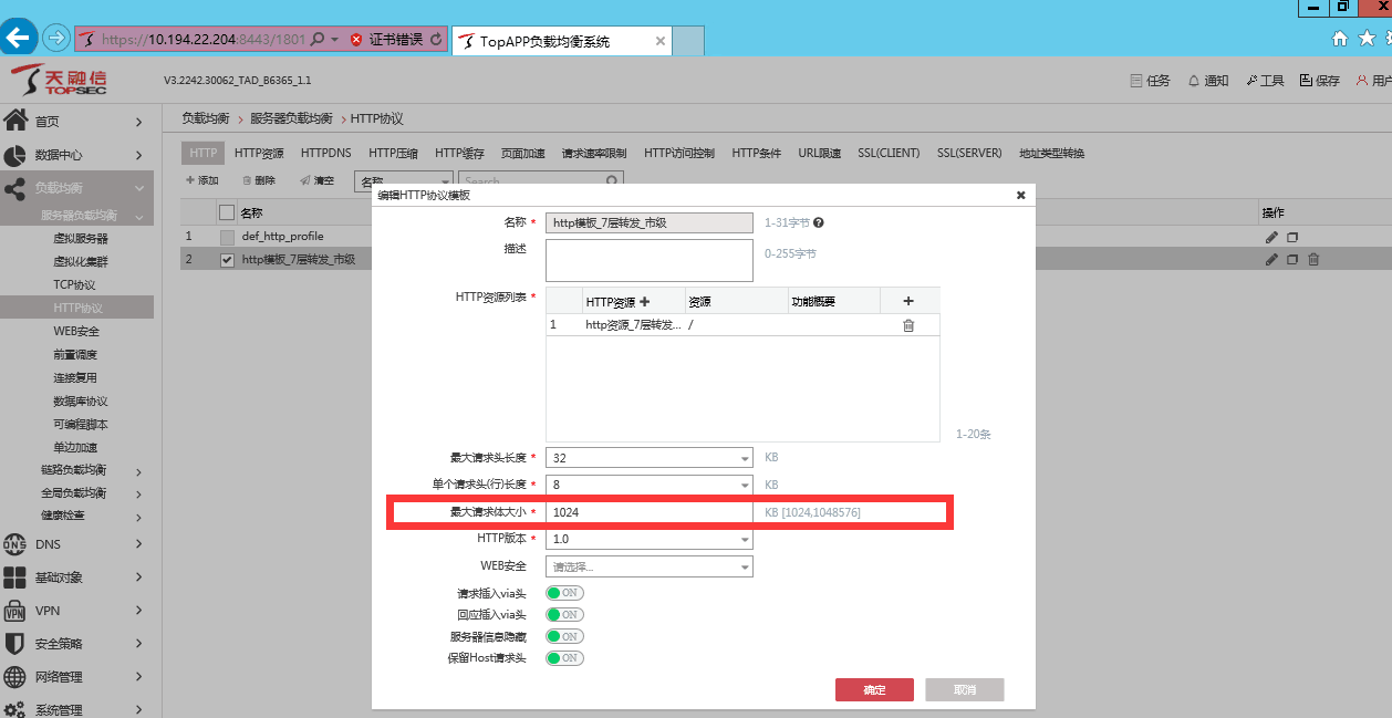 问题:负载均衡器设置了保留源地址转发的七层策略之后,提示413 Request Entity Too Large,如下图: