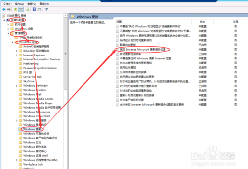 依次展开“计算机配置”->“管理模板”->“Windows组件”->“Windows更新”,找到“指定Intranet Micorsoft更新服务位置”,如下图所示
