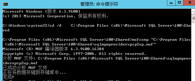 2、mofcomp "C:Program Files (x86)Microsoft SQL Server100Sharedsqlmgmproviderxpsp2up.mof"