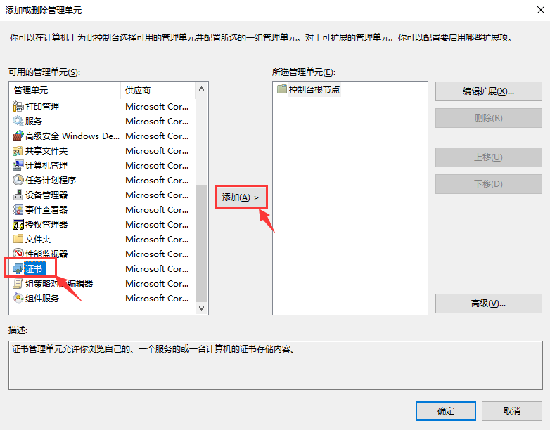 (4)在【可用的管理单元】中单击【证书】>【添加】>【计算机账户】>【本地计算机(运行此控制台的计算机)】>完成。