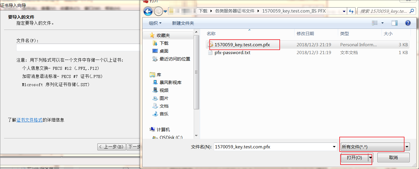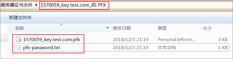 文件中有一个证书文件(以.pfx为后缀或文件类型)和一个秘钥文件(以.txt为后缀或文件类型)