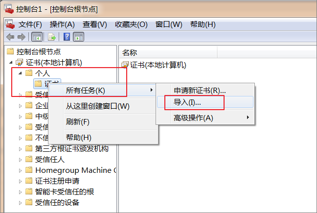 (5)单击【个人】>【证书】>【所有任务】>【导入】打开证书导入向导对话框。