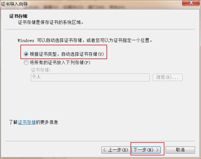 (8)勾选【根据证书类型】,【自动选择证书存储】并单击【下一步】完成证书的导入。