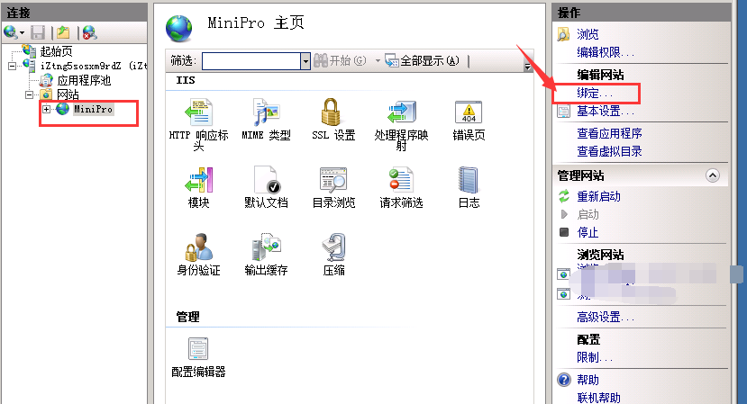 (9)在IIS管理面板,找到要部署证书的站点,点击绑定