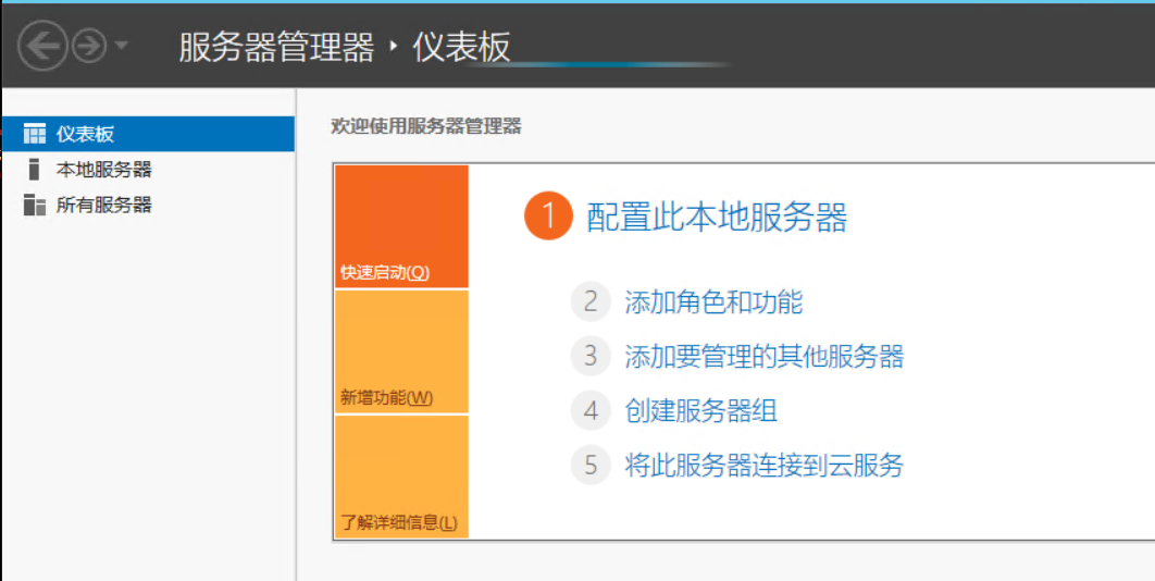 打开服务器管理器的仪表盘,点击添加角色和功能,如下图: