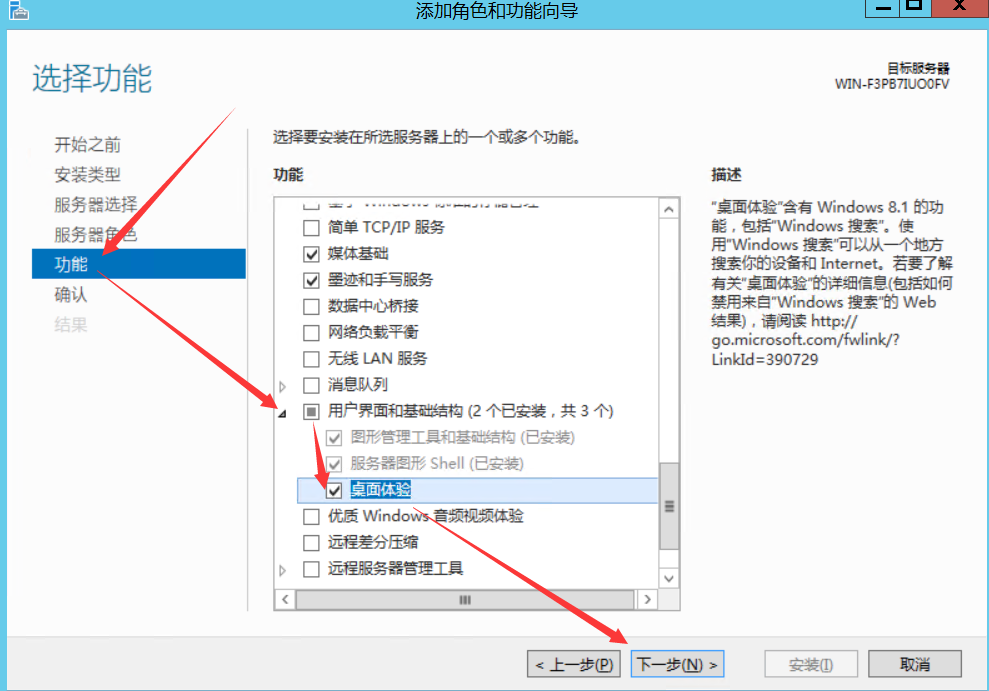 在功能这一步骤,展开用户界面和基础机构,勾选桌面体验,然后点击下一步。如下图
