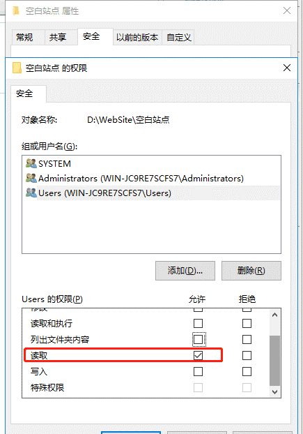 再配置一下文件夹权限,给Users分配“读取”权限(只给这个权限就可以了)。