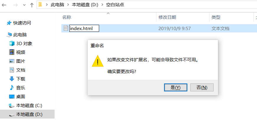 再在网站所的主目录(那个空白文件夹)下新建一个文本文件,并改名成index.html