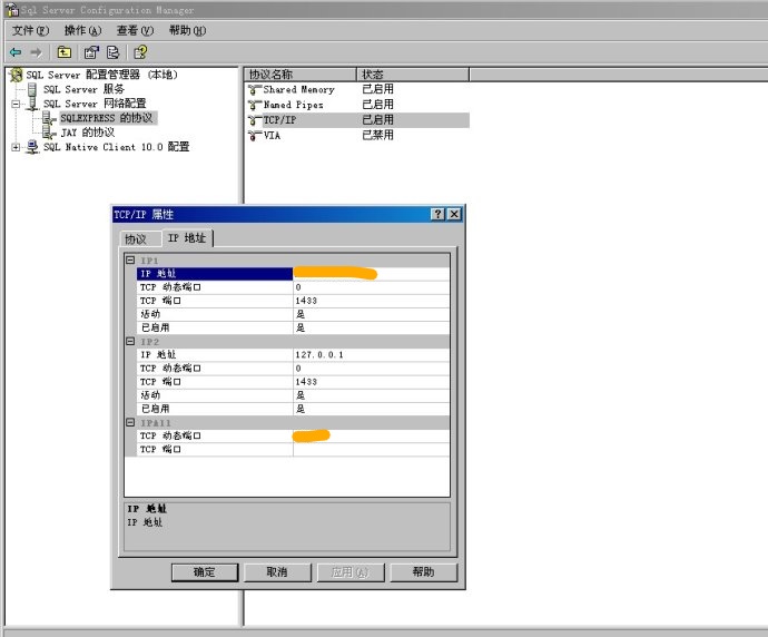 植入SQLEXPRESS的协议下面那个JAY的协议根据电脑不同可能会不同,点击按照如上同样的设置。