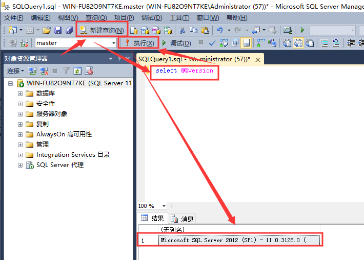 解决方案:新建查询,输入“select @@version”,然后右键选择“执行”。