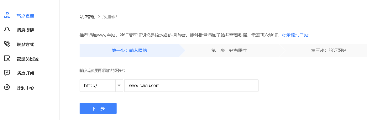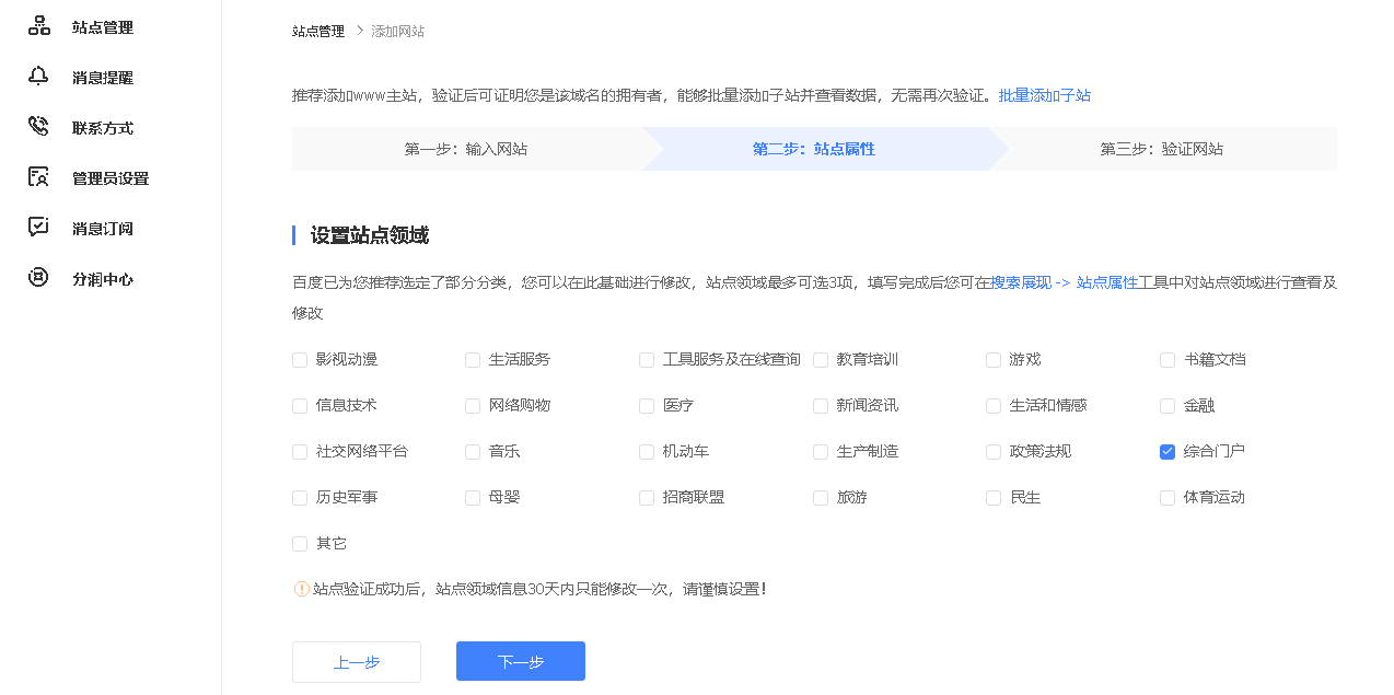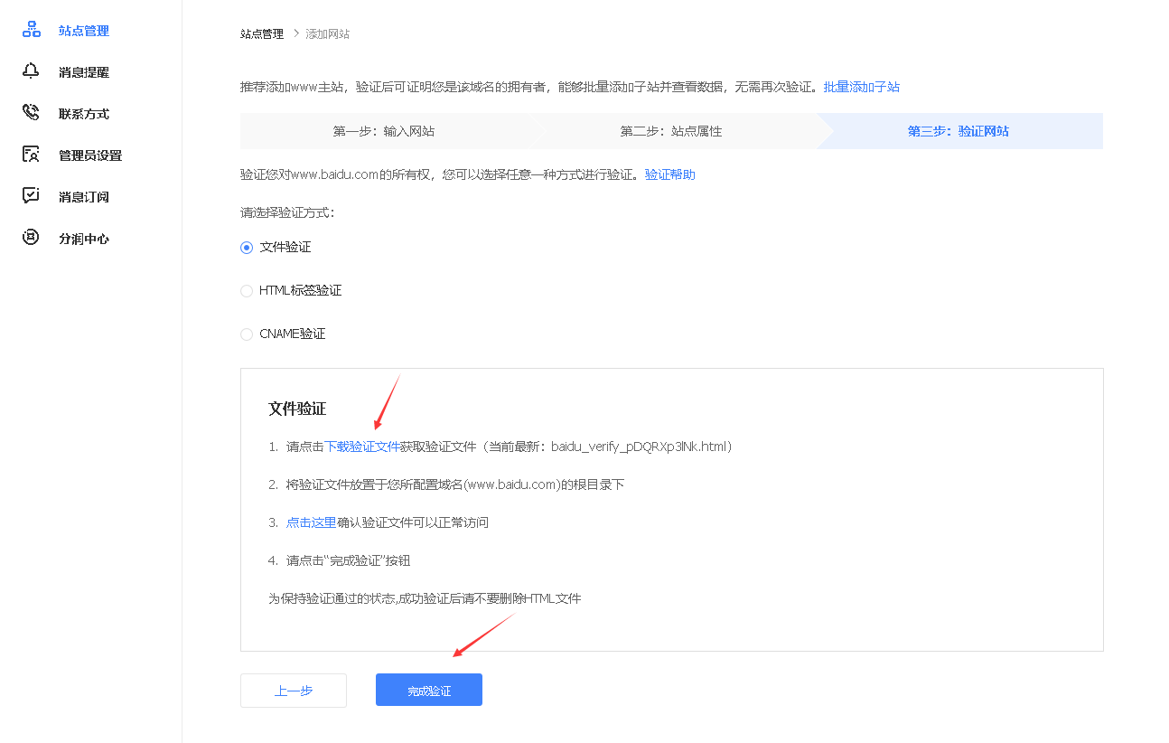 二、操作三步骤:1.输入网站地址;2.站点属性一般选择门户网站;3.下载文件放到网站根目录,完成验证即可。