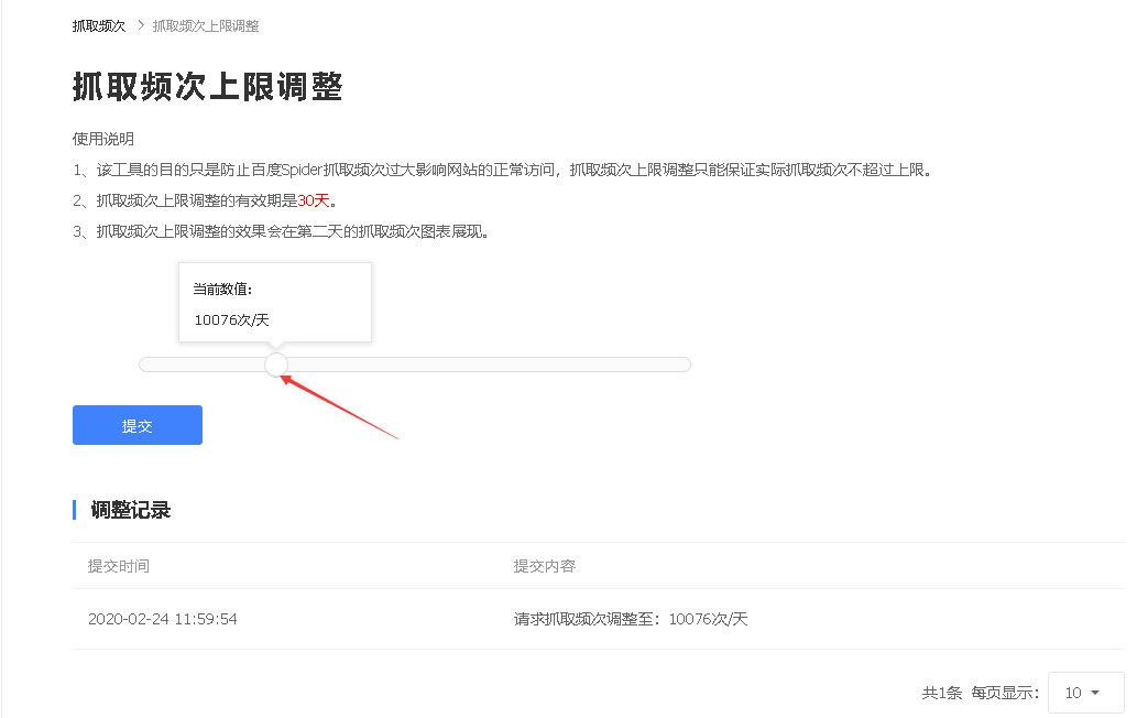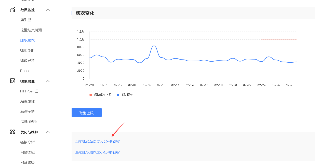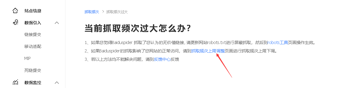 三、点击抓取频次,右侧“当前抓取频次过大如何解决”,然后选择“抓取频次上限调整”,即可鼠标拖动来调整抓取频次。