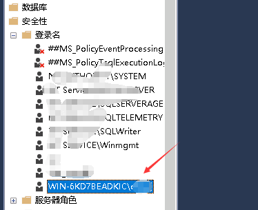 问题解决:打开management studio—安全性—登录名—将本地windows身份验证的账户名称,改为新的超管名称即可。