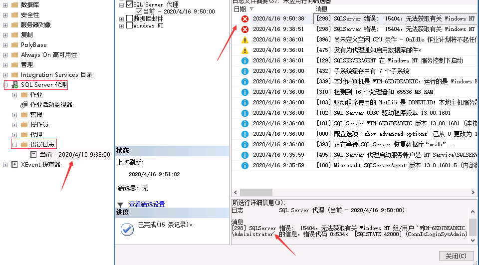 问题解决:检查是由于安装sql之后,修改了默认的administrator名称,所以sql获取不到新的账户名称。