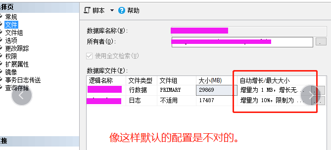 3、数据库的日志文件“增量大小为10%,限制大小”,这就是SQL日志中报错的根源。因为日志文件非常大时(几GB甚至几十GB),一次扩容就会要扩容几百MB,而磁盘写入的性能一般才每秒几十MB,从而会导致扩容超时。试多几次一直报错,就会整个崩掉。正确的配置应该是“增量为64MB,增长无限制”。