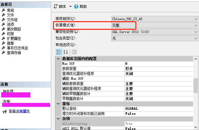 1、恢复模式配置成“完整模式”会导致数据库日志文件会非常非常大,可能有几十甚至几百GB。所以应该改成“简单”。