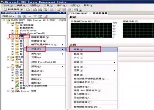 2.选择数据库,右键依次选择”任务”--> ”分离”。